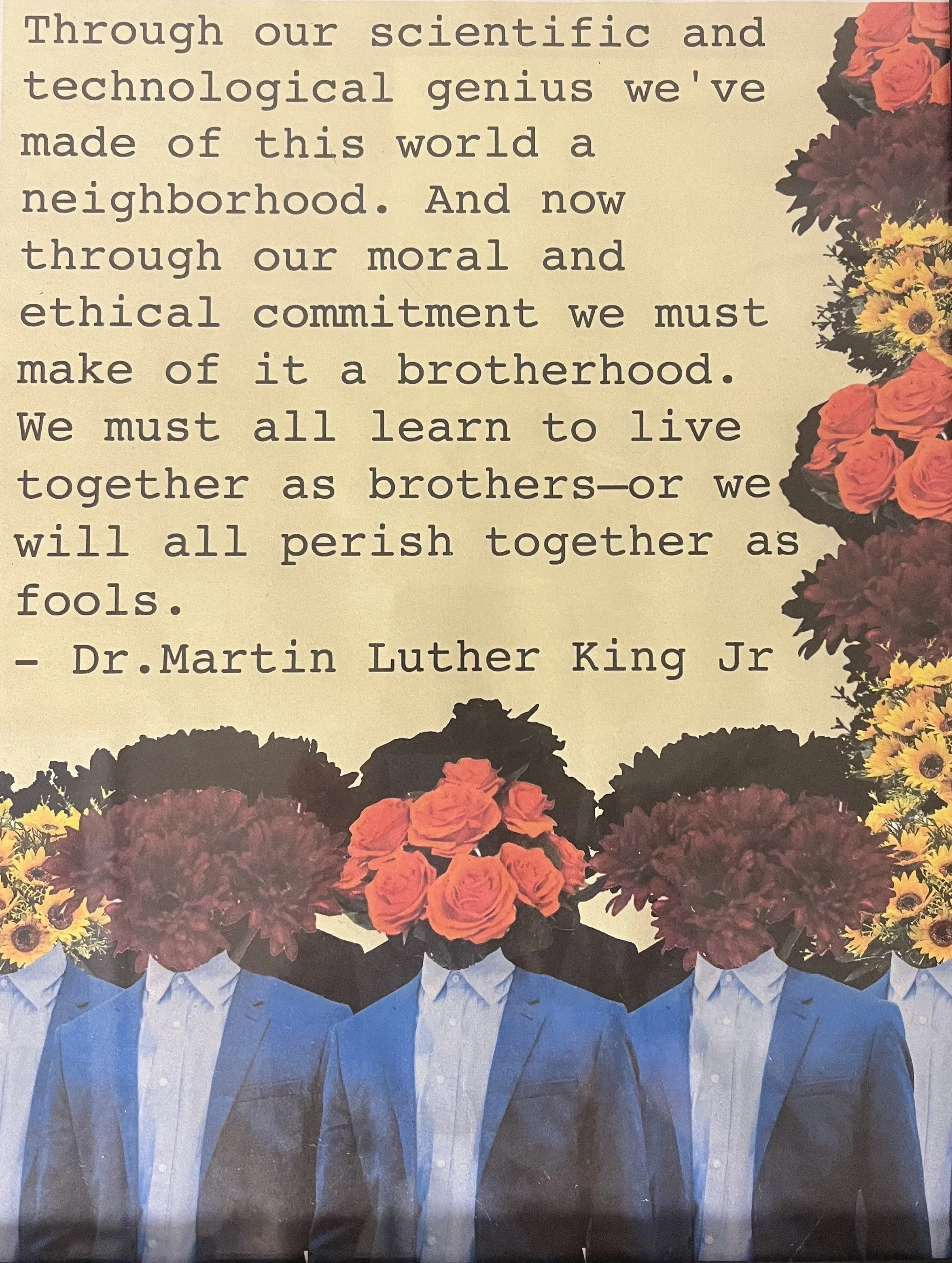 The heads of the suits being replaced with flowers played into them being deceased not only because of the quote, but as my interpretation of it focusing on unity and brotherhood.
